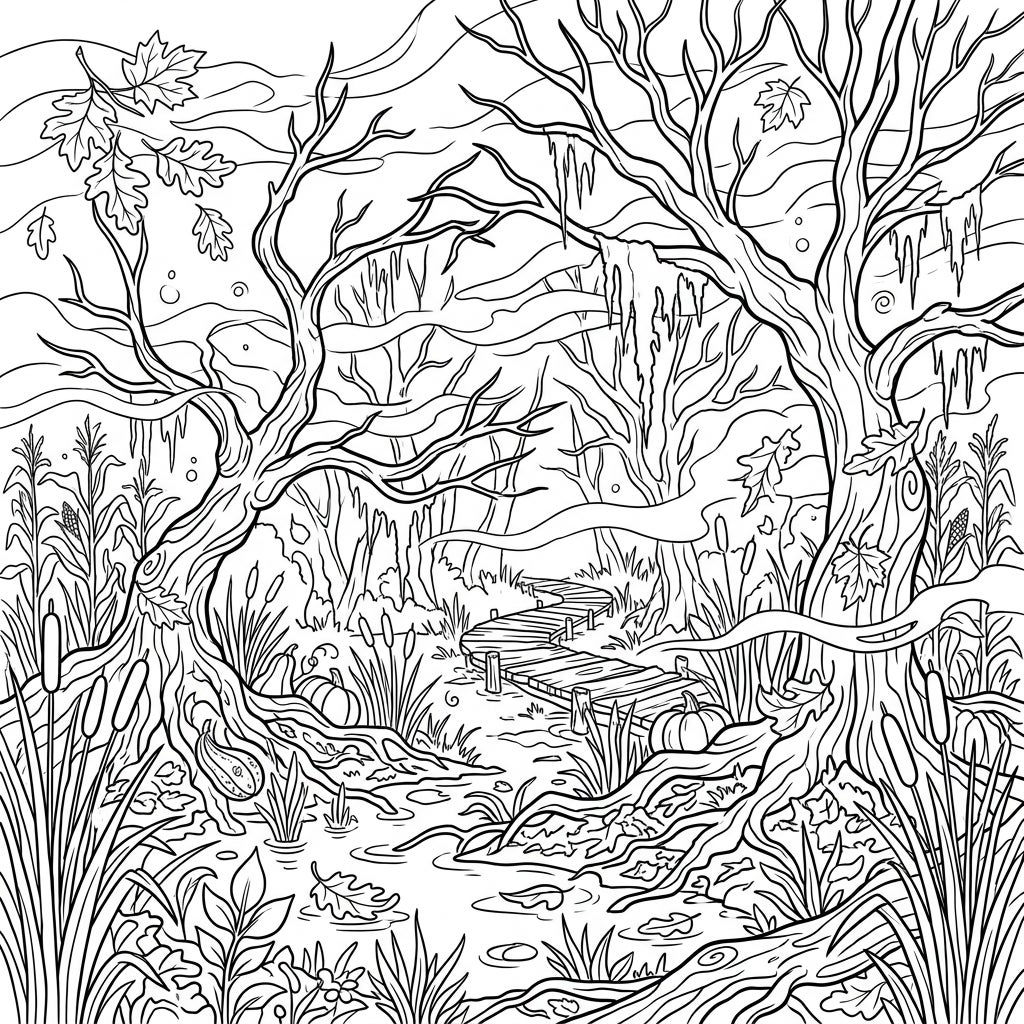 Journey into an enchanting autumn scene with this detailed misty swamp coloring page. Discover gnarled trees, a winding boardwalk, and hidden harvest elements, perfect for a cozy fall coloring session.