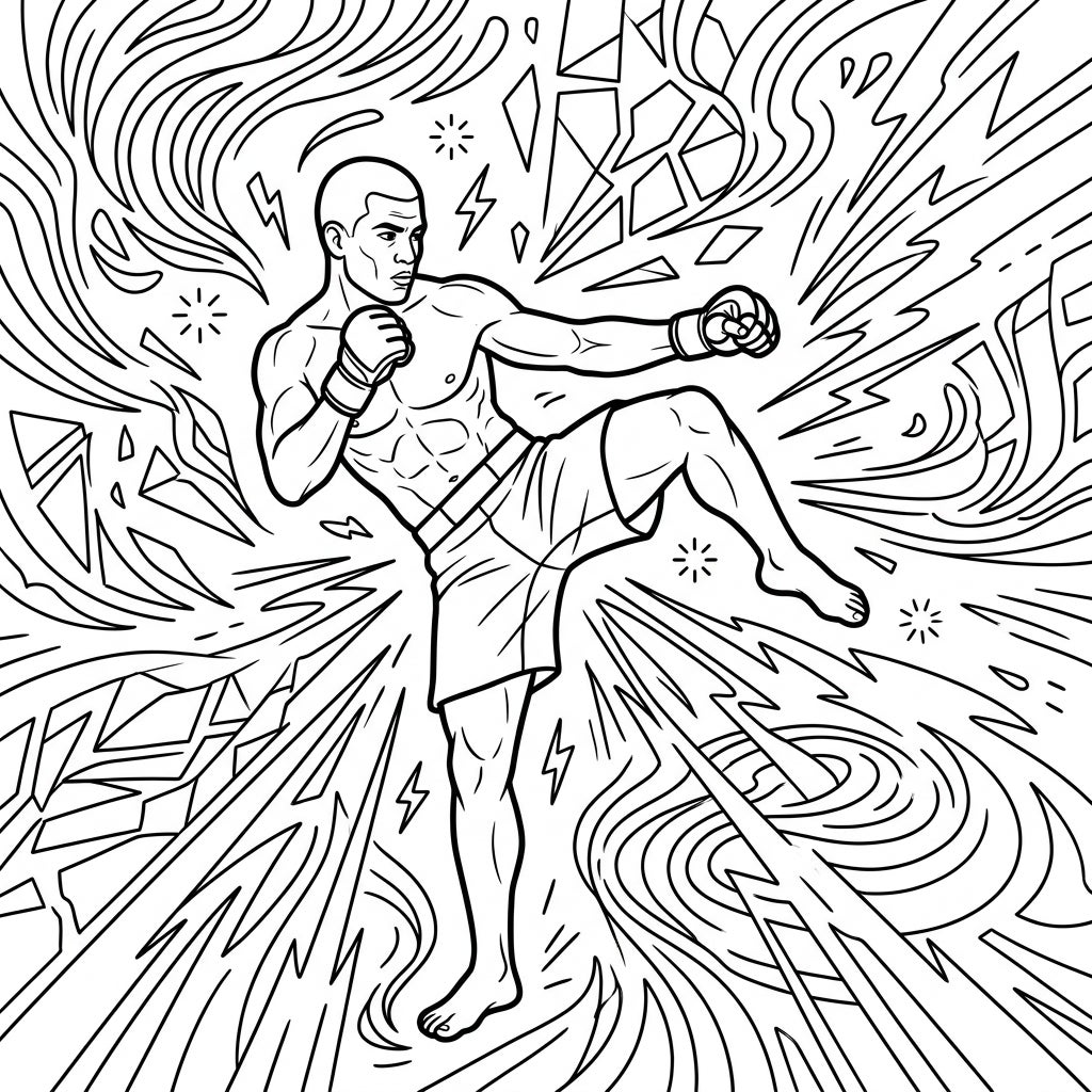 This template offers endless creative possibilities. You can choose realistic skin tones and gear colors, or perhaps delve into a more fantastical palette, making the energy bursts around him glow with vibrant hues. Experiment with blending techniques to emphasize his musculature and the depth of the background patterns. Whether you opt for sharp contrasts or subtle gradients, this Mixed Martial Artist coloring page promises a truly engaging and rewarding artistic journey, perfect for unwinding and expressing your passion for action.