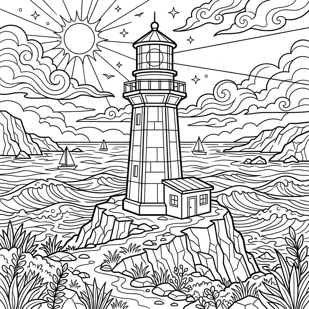 Embark on a creative journey with this modern lighthouse coloring page designed especially for kids. Discover a detailed coastal scene, complete with a majestic lighthouse, crashing waves, and sailing boats, just waiting for a splash of color.