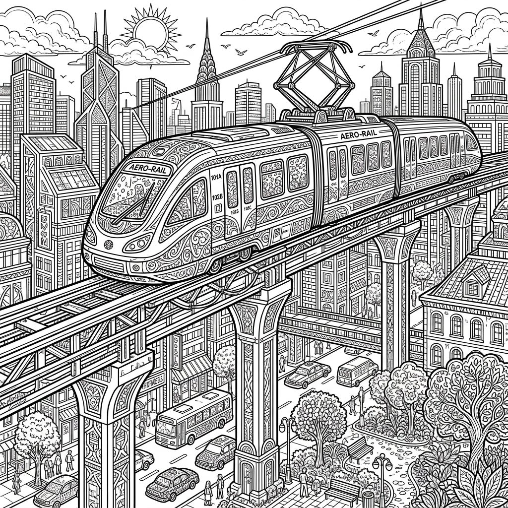 Embark on a captivating coloring adventure with this intricate monorail train scene designed for adult colorists. Discover detailed urban landscapes and a modern transport system, perfect for mindful relaxation.