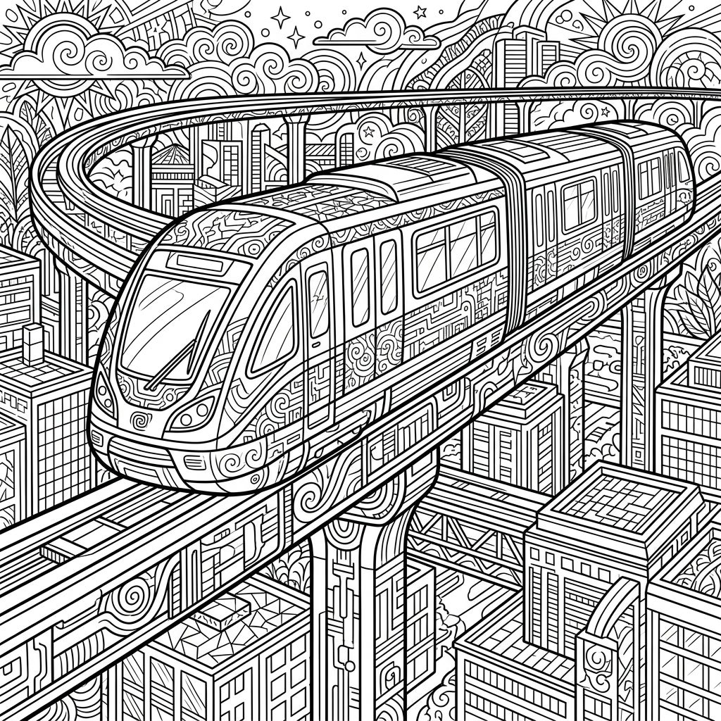 Immerse yourself in urban wonder with this sophisticated monorail train adult coloring page. Featuring an intricately designed elevated track winding through a vibrant, patterned cityscape, it promises a truly engaging artistic escape.