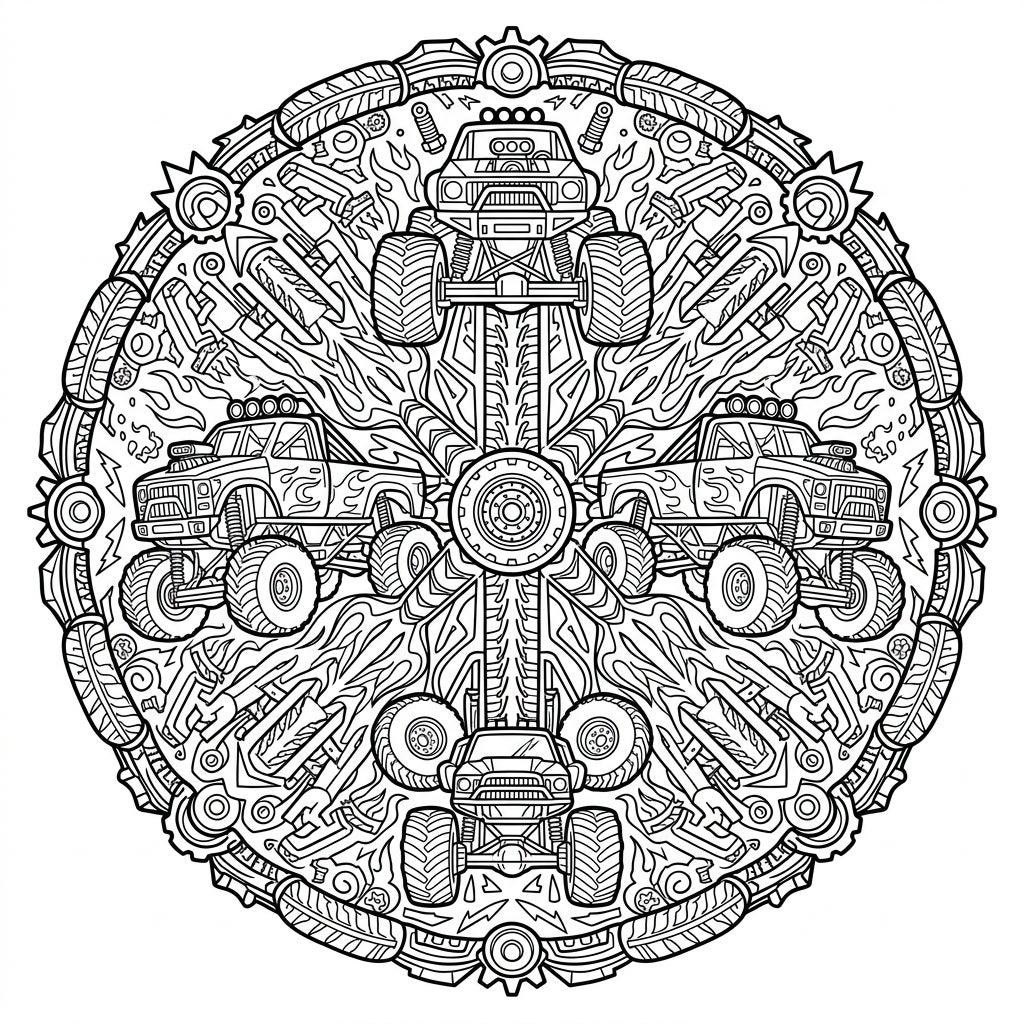 Dive into the thrilling world of monster trucks with this unique mandala coloring page. Experience the powerful symmetry and intricate details of a design that's ready for your creative touch.