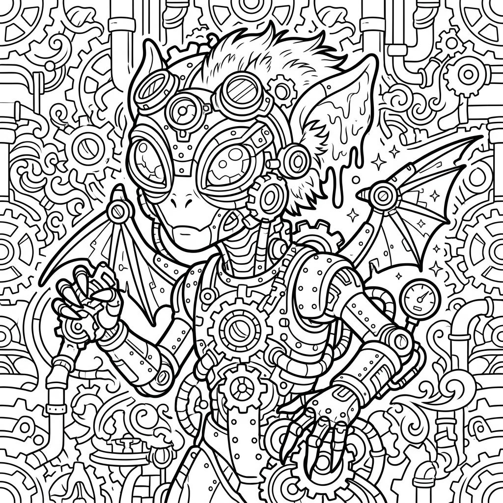 Dive into a world where alien meets antique with this incredibly detailed steampunk creature coloring page. Discover a unique being adorned with gears, goggles, and intricate machinery, set against a backdrop of Victorian-industrial fantasy ready for your artistic touch.