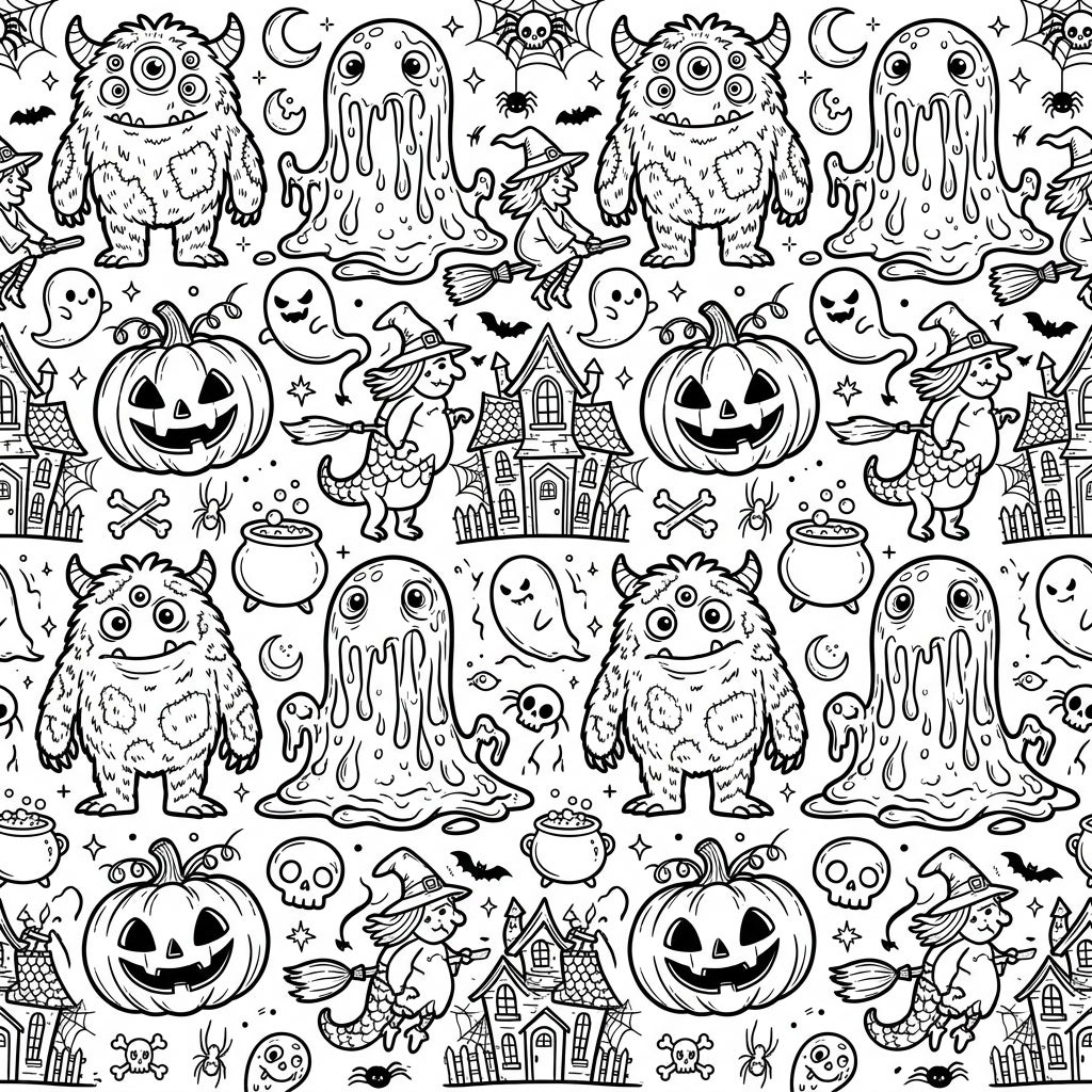 Explore a whimsical world of Halloween fun with this captivating seamless pattern! Discover an array of adorable, multi-eyed monsters with textured fur and oozing, blob-like creatures, perfectly intertwined with classic spooky symbols. You'll find cheerful jack-o'-lanterns, cackling witches soaring on broomsticks, friendly ghosts, and charming haunted houses, all forming an intricate and delightful repeating design.