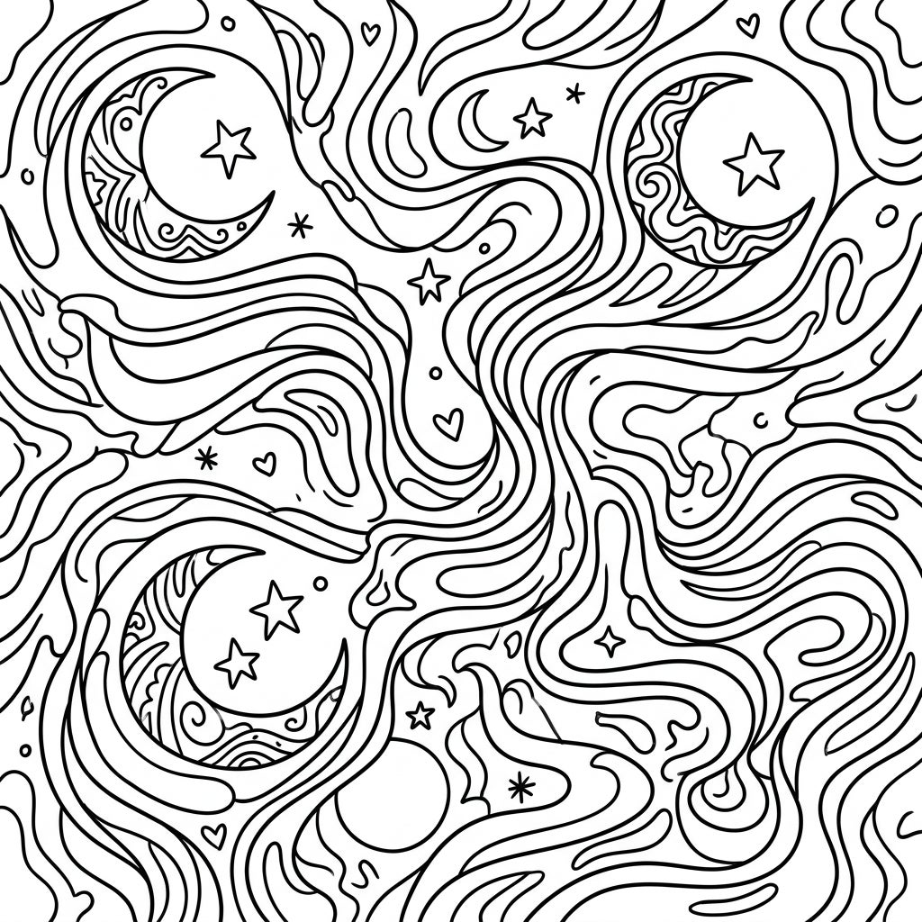 Embark on a captivating artistic journey with this mesmerizing coloring page, where the ethereal essence of moon dust meets a vibrant psychedelic vision. The design is a symphony of intricate, flowing organic shapes that dance across the page, creating a dynamic and immersive visual experience. You'll discover elegantly decorated crescent moons, twinkling stars, and tiny hearts nestled within the swirling currents, all designed to challenge your perception and ignite your creativity.