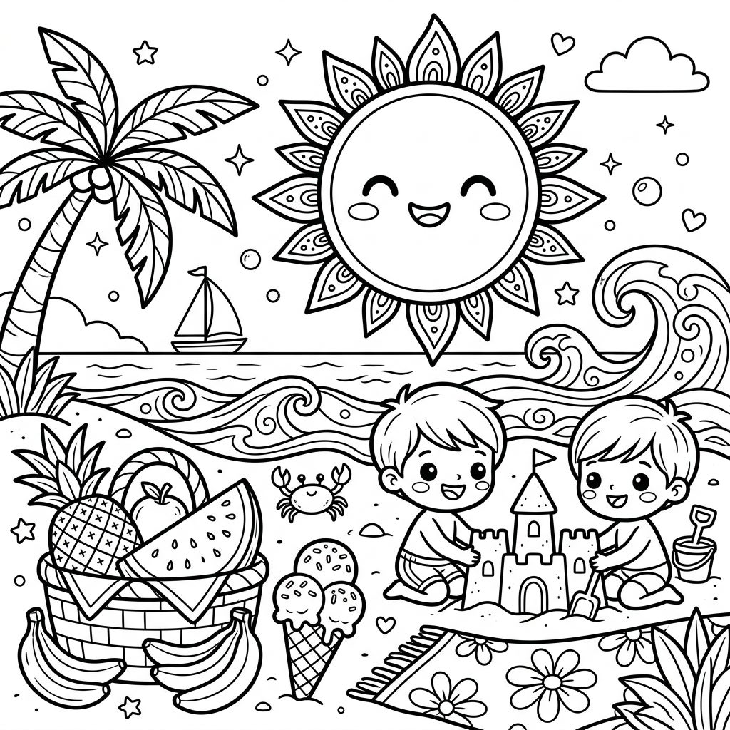This charming coloring page captures the essence of a perfect summer day at the beach, seen through the eyes of a radiant morning sun. In the foreground, two joyful children are engrossed in building an elaborate sandcastle, complete with a shovel and bucket, highlighting their playful spirit. Beside them, a tempting spread of summer delights fills a picnic basket, featuring a juicy watermelon slice, a ripe pineapple, a crisp apple, and a bunch of bananas, alongside a delicious-looking ice cream cone. The scene is further brought to life with a small, friendly crab scuttling nearby and a patterned beach blanket.