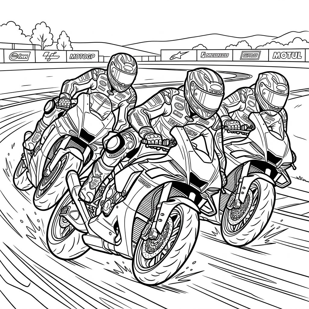 Dive into the adrenaline-pumping world of MotoGP with this incredibly detailed coloring page! This scene captures three fierce competitors mid-race, their motorcycles expertly angled as they navigate a thrilling turn. Notice the intricate lines defining their racing suits, helmets, and the powerful bikes, each designed to convey speed and precision. The dynamic composition, complete with speed lines and tire spray, brings the excitement of the track right to your fingertips.