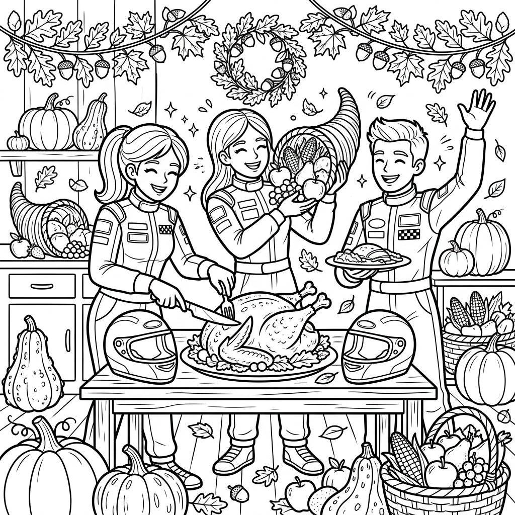 Dive into a wonderfully detailed coloring template featuring a heartwarming Thanksgiving celebration unlike any other! Here, three spirited motor racers, clad in their distinctive race suits, gather around a bountiful table. One racer skillfully carves a golden-brown turkey, while another proudly displays a brimming cornucopia overflowing with fruits and vegetables. Their helmets rest beside them, a playful nod to their thrilling profession, all set amidst a vibrant tableau of pumpkins, gourds, and autumn leaves that promise hours of engaging coloring.