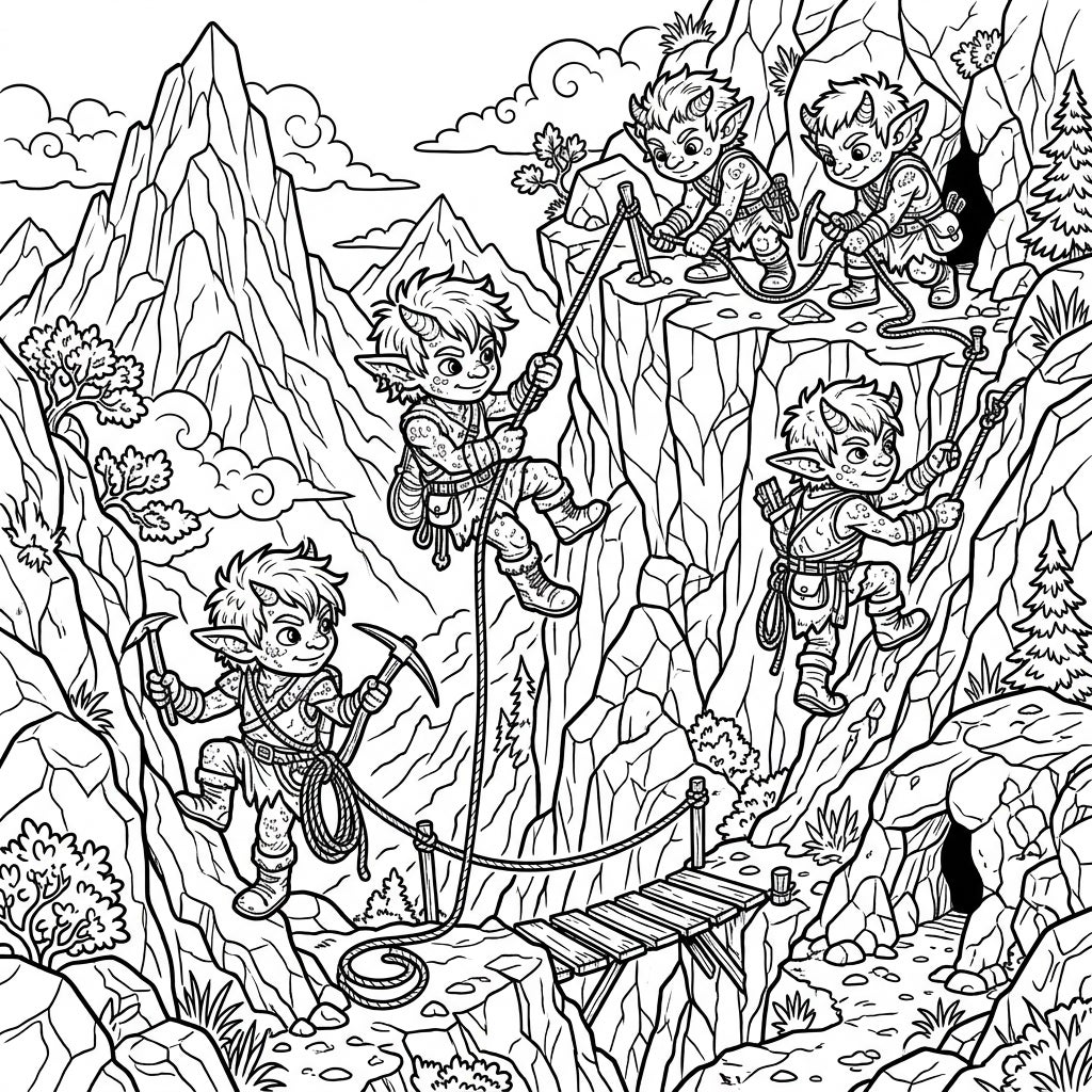 Dive into an exciting world where mischievous Mountain Goblins conquer challenging peaks. This detailed coloring page invites you to bring their daring rock-climbing expedition to life with your favorite colors.