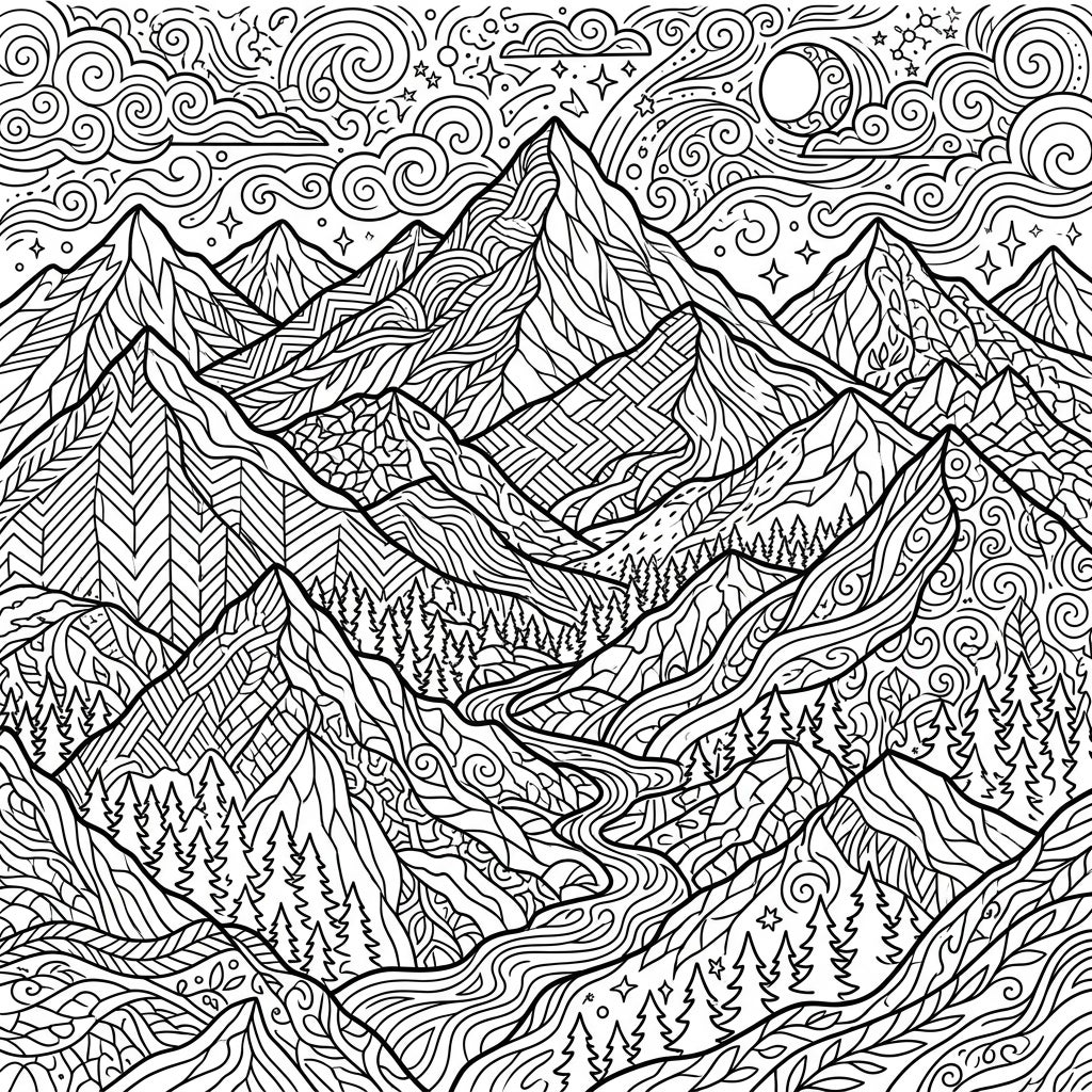 Immerse yourself in the breathtaking beauty of this intricate mountain range coloring page. This stunning design showcases a panoramic vista of towering peaks, each adorned with a unique tapestry of stylized patterns, from sharp geometric angles to flowing organic lines. A serene river meanders through the foreground, flanked by a dense forest of meticulously drawn pine trees, while the celestial canopy above presents swirling clouds, twinkling stars, and a peaceful crescent moon, all waiting for your artistic touch.