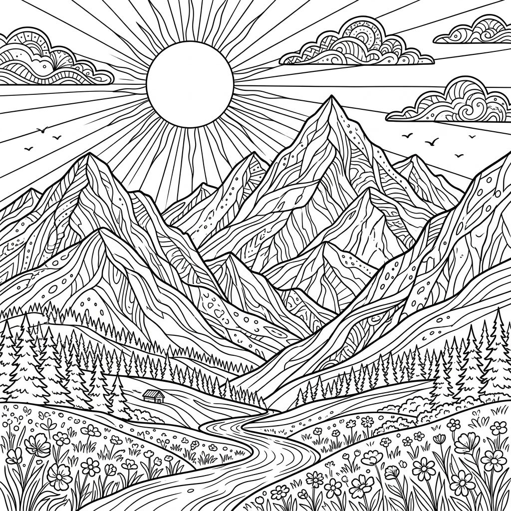 This stunning coloring page invites you to explore a breathtaking summer mountain scene, designed specifically for adult enthusiasts. Majestic peaks rise dramatically, adorned with intricate patterns and textures that beg for your creative touch. Above, a radiant sun casts its rays over the landscape, accompanied by artistically patterned clouds. Below the towering mountains, a lush pine forest gives way to gentle rolling hills, a charming small cabin nestled in the valley, and a serene river winding its way through a vibrant field of diverse wildflowers. Every element is crafted with fine detail, ensuring a rich and engaging coloring experience.