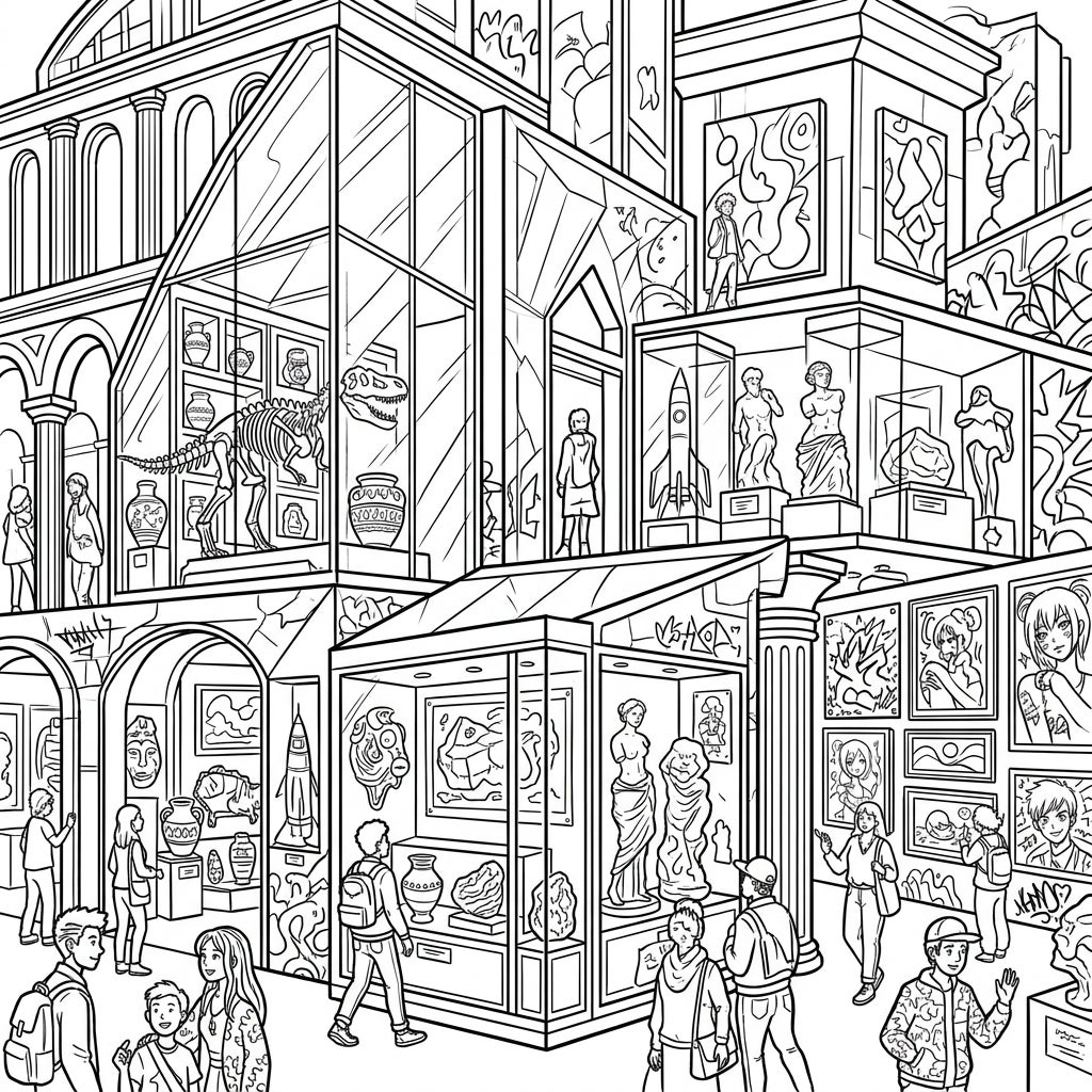 Step into a world of discovery with this incredibly detailed coloring template, showcasing a bustling contemporary museum designed to captivate teen imaginations. The intricate illustration presents a grand multi-level building, its modern glass and classic archways revealing a treasure trove of exhibits. You'll find ancient dinosaur skeletons standing guard, delicate historical pottery in display cases, classical sculptures evoking timeless beauty, and even futuristic rocket models hinting at scientific advancements. The walls are adorned with diverse art, from abstract paintings to stylized portraits, reflecting a blend of traditional and trendy aesthetics perfect for an engaged audience.