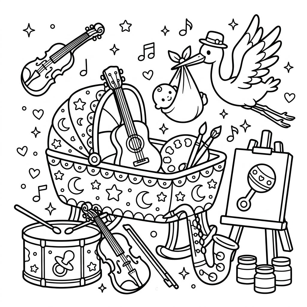 Bring this adorable scene to life with your favorite colors! You could use soft pastels to enhance the gentle baby shower theme for the bassinet and stork, or opt for bright, bold hues to make the musical instruments and art supplies pop with energy. Encourage young colorists to imagine the sounds each instrument makes and the vibrant paintings the tiny artist might create. This page is perfect for developing fine motor skills, color recognition, and sparking conversations about music, art, and the precious miracle of new life.