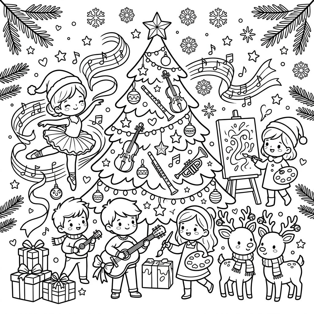 This charming coloring page brings together the joy of Christmas with the beauty of music and art, specially crafted for young colorists. At its heart stands a festive Christmas tree, adorned not only with traditional ornaments but also with miniature violins, a flute, and a trumpet, symbolizing a harmonious holiday. Around it, adorable children are engaged in various creative activities: a graceful ballerina dances to festive tunes, another child joyfully paints on an easel, and two friends strum their musical instruments, all surrounded by beautifully wrapped gifts, playful reindeer, and delicate snowflakes.