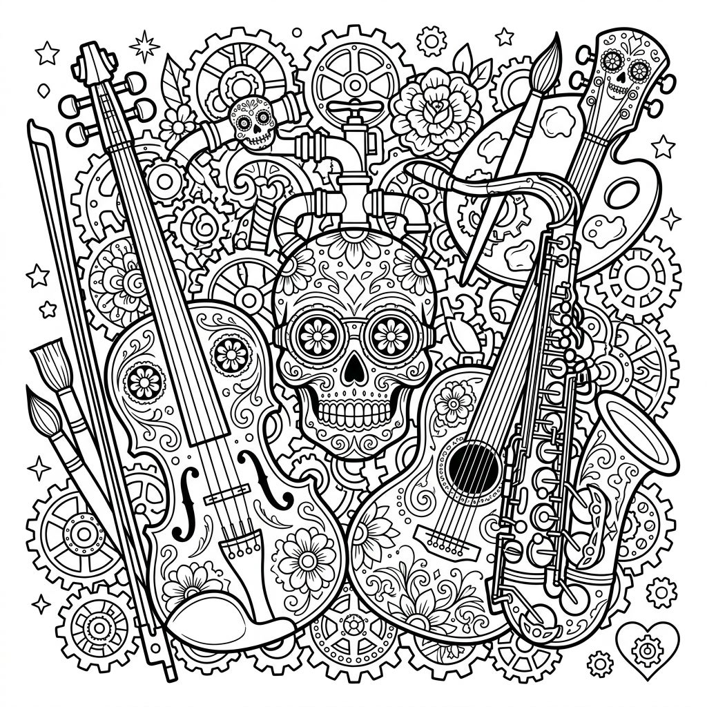 Explore a mesmerizing fusion of Steampunk mechanics, vibrant Day of the Dead imagery, and the elegance of Music & Arts. This intricate coloring page invites you to bring a world of gears, sugar skulls, and instruments to life with your unique palette.