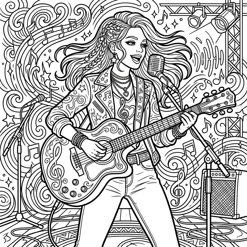 This captivating coloring page captures the energy of a live musical performance, showcasing a talented female musician in the spotlight. She's depicted mid-song, passionately singing into a classic studio microphone while strumming an acoustic guitar adorned with intricate swirling patterns. Her stylish ensemble, featuring a studded or patterned leather jacket, chic jewelry, and flowing hair with braids, adds to her rock star appeal, inviting colorists to explore diverse textures and shades.