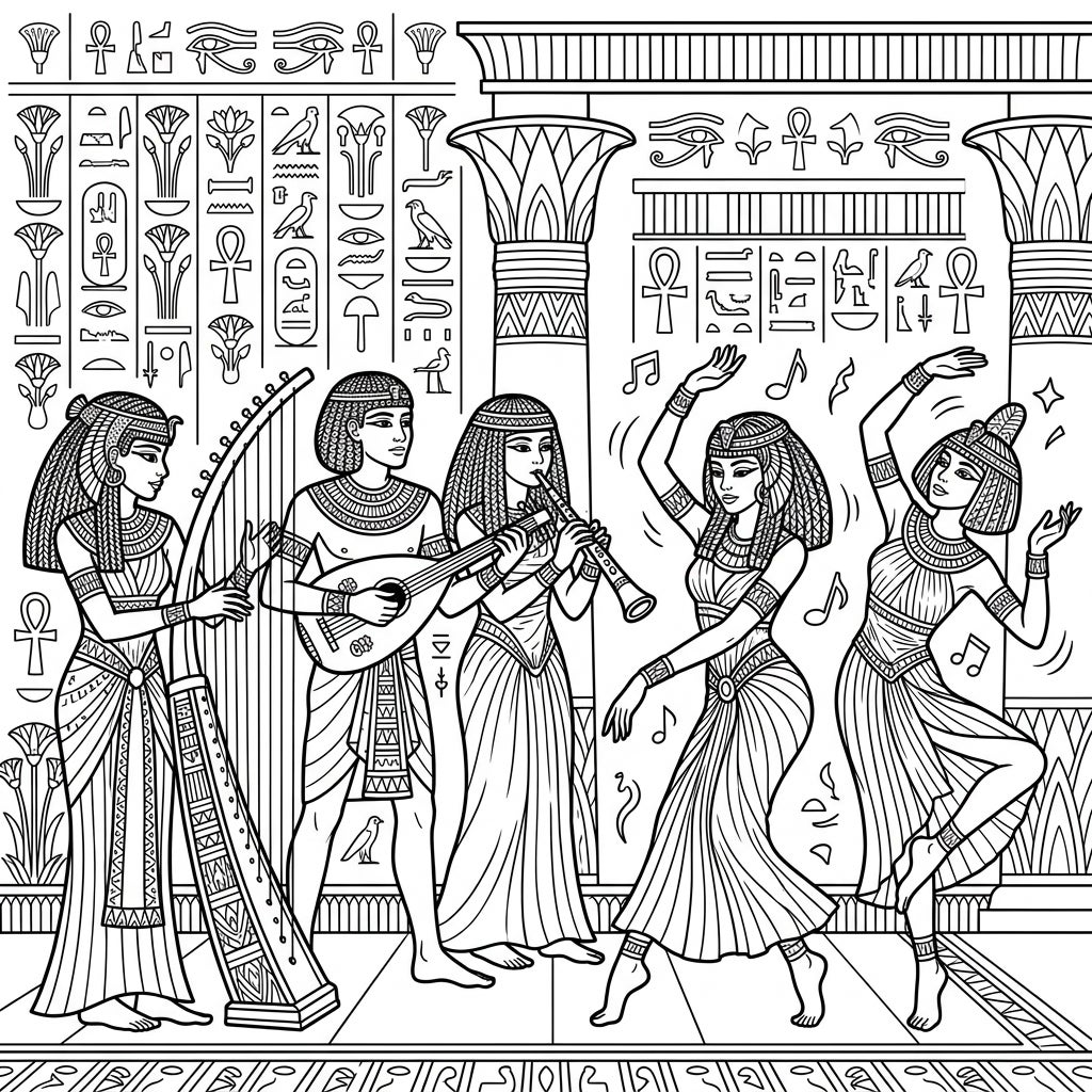 This intricate coloring page transports you directly to a grand hall in ancient Egypt, where an unforgettable celebration is underway. Five figures, adorned in traditional Egyptian attire and elaborate headdresses, command the scene. On the left, a serene woman plays a majestic standing harp, while next to her, a man strums a lute-like instrument. A third woman contributes with a flute, her music complementing the rhythmic movements of two graceful dancers who captivate the audience with their spirited performance. The backdrop features towering columns with ornate capitals and walls richly decorated with hieroglyphs, ankh symbols, and various Egyptian motifs, all waiting for your artistic touch.