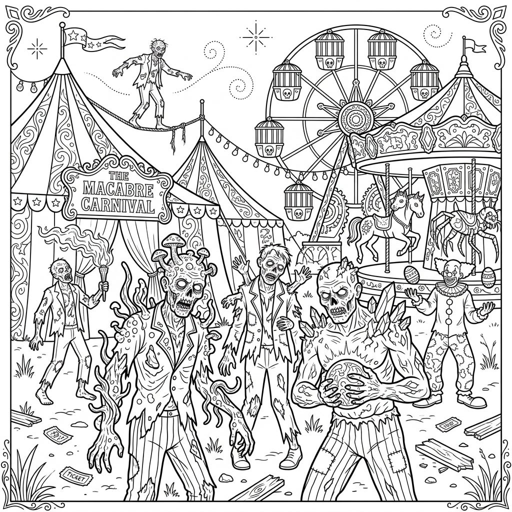 Prepare for an extraordinary coloring adventure at 'The Macabre Carnival,' where the undead take center stage amidst a twisted fairground. This intricate scene features several unique mutated zombies: one adorned with grotesque mushroom growths and writhing tendrils, another sporting jagged crystal formations, and even a chilling zombie clown. Above the chaos, a brave (or foolish) zombie performs a precarious tightrope walk between ominous circus tents, while classic carnival rides like a Ferris wheel with skull-emblazoned gondolas and a carousel featuring skeletal horses and a colossal spider add to the eerie charm.