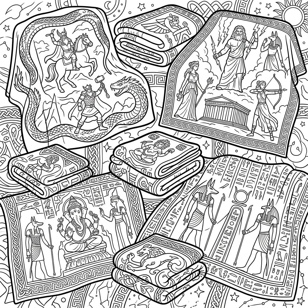This captivating coloring template presents a lavish spread of blankets, each meticulously illustrated with iconic mythological figures from across the globe. From the mighty Norse gods like Thor and Odin battling mythical beasts, to the majestic Greek pantheon featuring Zeus, Hera, and Artemis, and the revered deities of Egyptian and Hindu lore such as Anubis, Horus, and Ganesha, every blanket is a gateway to ancient tales. The entire scene is rich with detail, offering a delightful challenge for colorists to bring these legendary characters and their intricate cultural patterns to life.