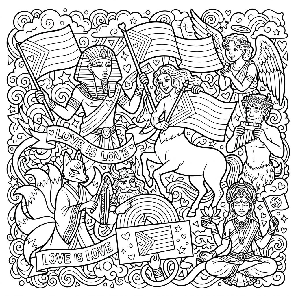 This incredibly detailed coloring page invites you to explore a universe where mythical figures from various cultures unite in a joyous celebration. Discover iconic characters such as an Egyptian pharaoh, a graceful centaur, a serene angel, a playful satyr, a mystical Kitsune, a wise Viking warrior, and a peaceful Hindu deity. Each figure is depicted holding striped flags or banners proudly proclaiming 'LOVE IS LOVE', set against a dynamic background brimming with swirling clouds, sparkling stars, joyful hearts, and intricate geometric patterns, ensuring a rich and immersive coloring experience.