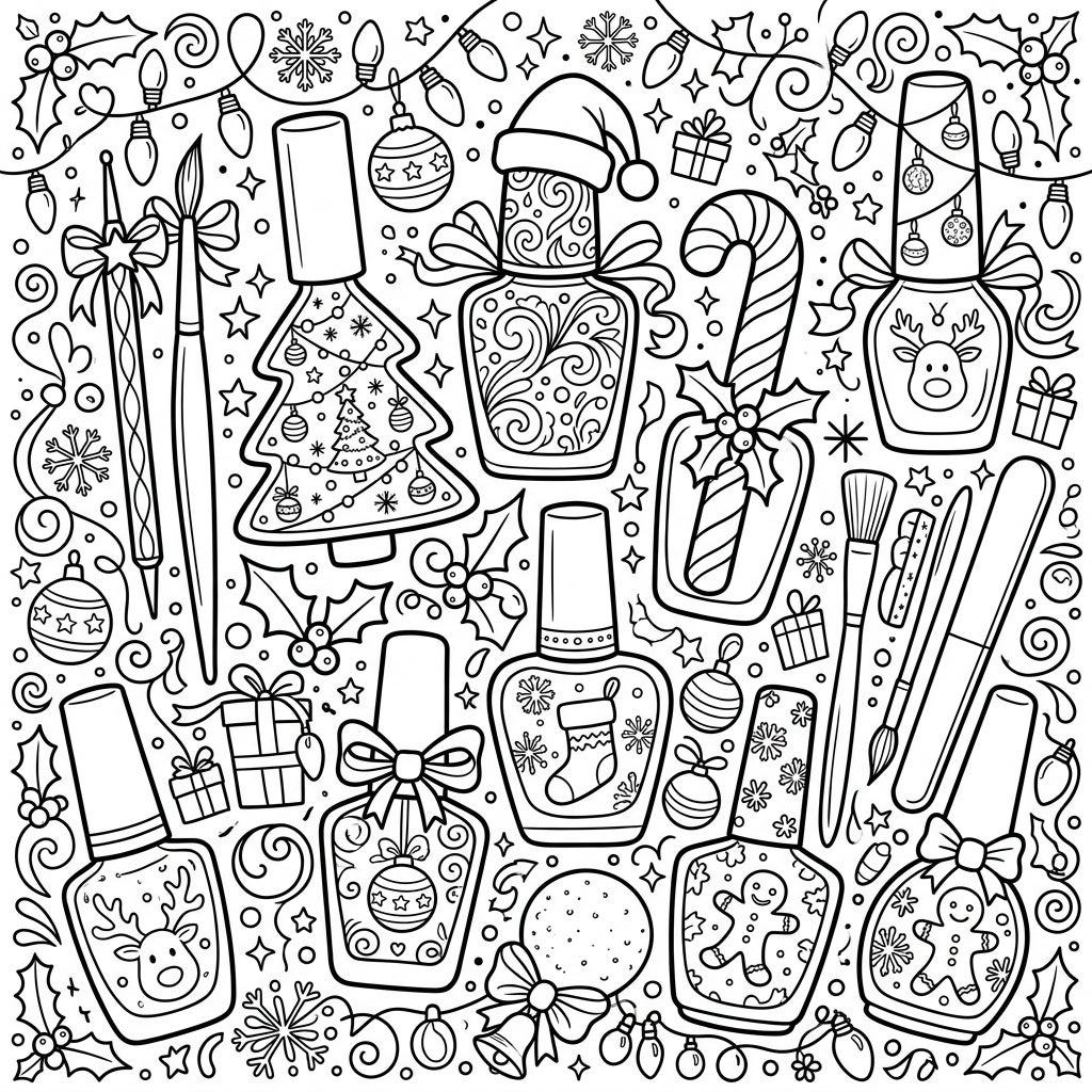 Celebrate the holidays with this unique Christmas Nail Polish coloring page, packed with festive bottles and charming manicure tools. Discover a delightful array of seasonal designs, from gingerbread men to sparkling snowflakes, ready for your creative touch.