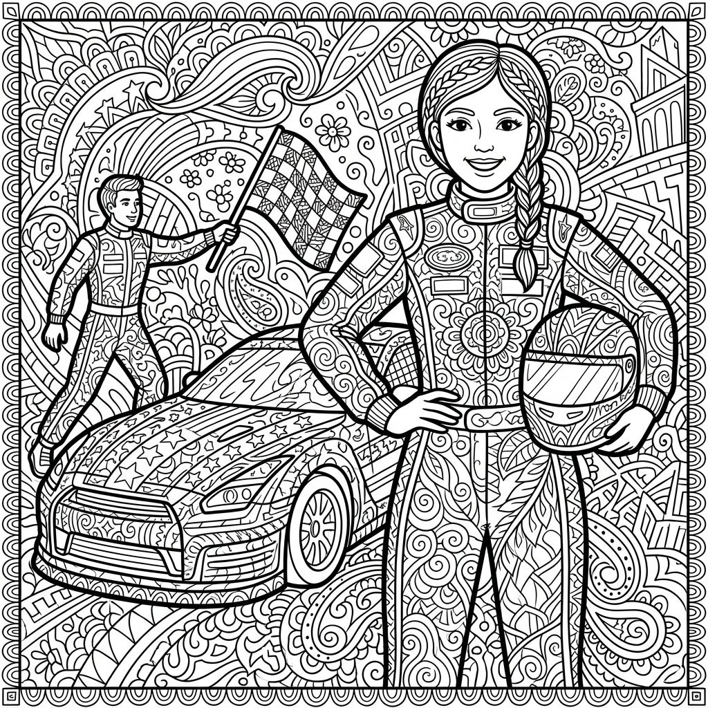 Unleash your inner artist on this spectacular Zentangle racing scene. Consider using a vibrant palette to bring the drivers' uniforms and the race car to life, perhaps incorporating team colors or inventing your own bold schemes. Experiment with different shades within the Zentangle patterns to create depth and texture, making each swirl and line pop. Don't be afraid to use markers, colored pencils, or even gel pens to highlight the intricate details, transforming this black-and-white template into a masterpiece of color and pattern. Get ready to create a winning design!