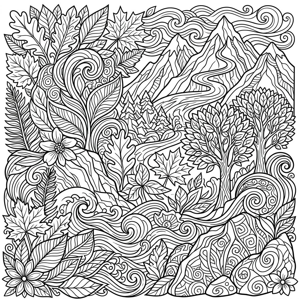 This exquisite coloring page invites you into a mesmerizing landscape, intricately woven with the wonders of nature. Delve into a scene where majestic mountains rise in the background, their peaks carved with winding paths and flowing rivers. Lush forests of pine trees stand alongside broad-leaved deciduous trees, while a rich assortment of leaves – from classic maple and oak to delicate ferns – frame the composition. Swirling currents of water and air patterns add a dynamic, organic flow, creating a harmonious and detailed tableau that promises a truly immersive coloring adventure.