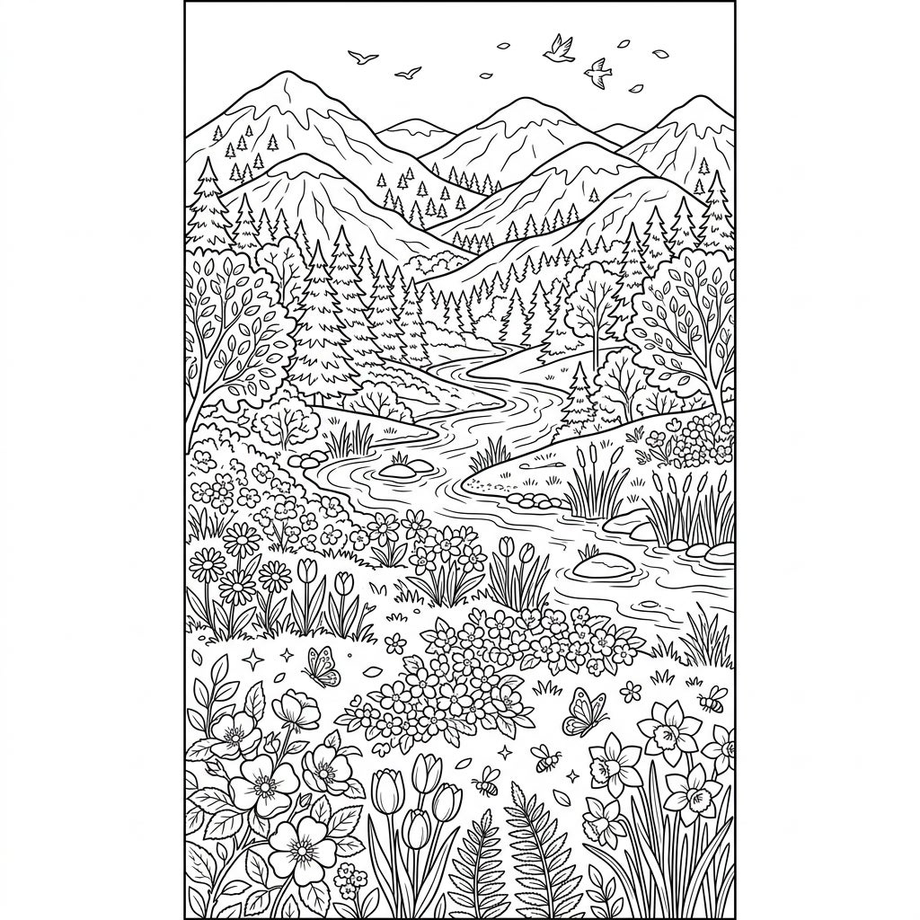 This exquisite coloring page transports you to a serene spring vista, rendered in a tall and narrow format perfect for a bookmark. Your eyes will wander over majestic mountains in the background, beneath a sky where birds playfully soar. A gently winding river carves its path through a dense forest of various trees, from sturdy pines to leafy deciduous canopies. The foreground bursts with life, showcasing a rich tapestry of blooming spring flowers including delicate tulips, cheerful daffodils, and tiny blossoms, complemented by lush ferns, verdant grasses, and charming details like fluttering butterflies and busy bees.