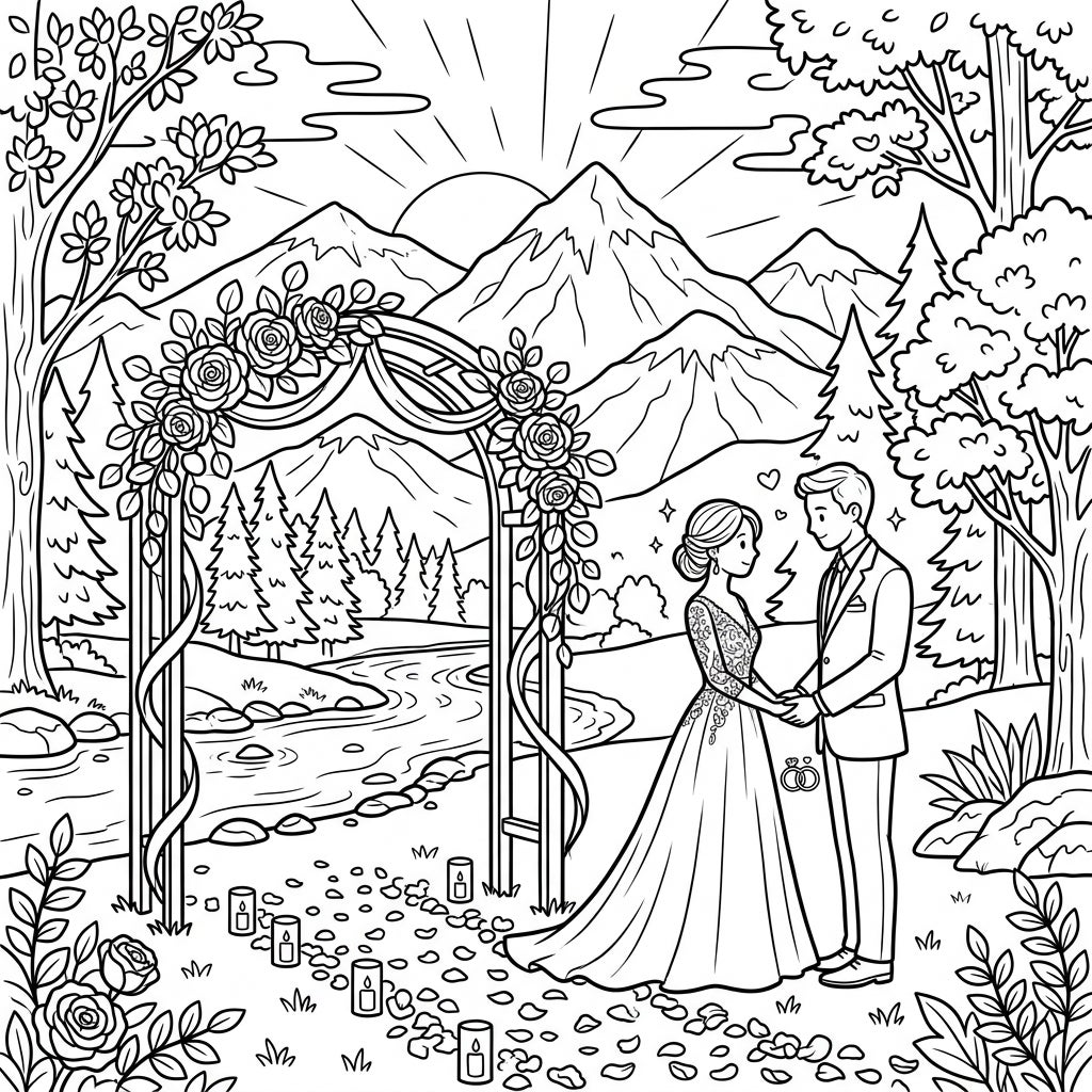 Step into a breathtaking scene where love blossoms amidst the grandeur of nature. This intricate coloring template showcases a happy bridal couple, hand-in-hand, poised beneath a magnificent arch adorned with lush roses and flowing ribbons. In the distance, majestic mountains rise proudly, while a serene river winds its way through a forest of pine trees, all under the gentle glow of a rising or setting sun. Delicate rose petals and flickering candles pave the aisle, setting a truly magical atmosphere for this special day.