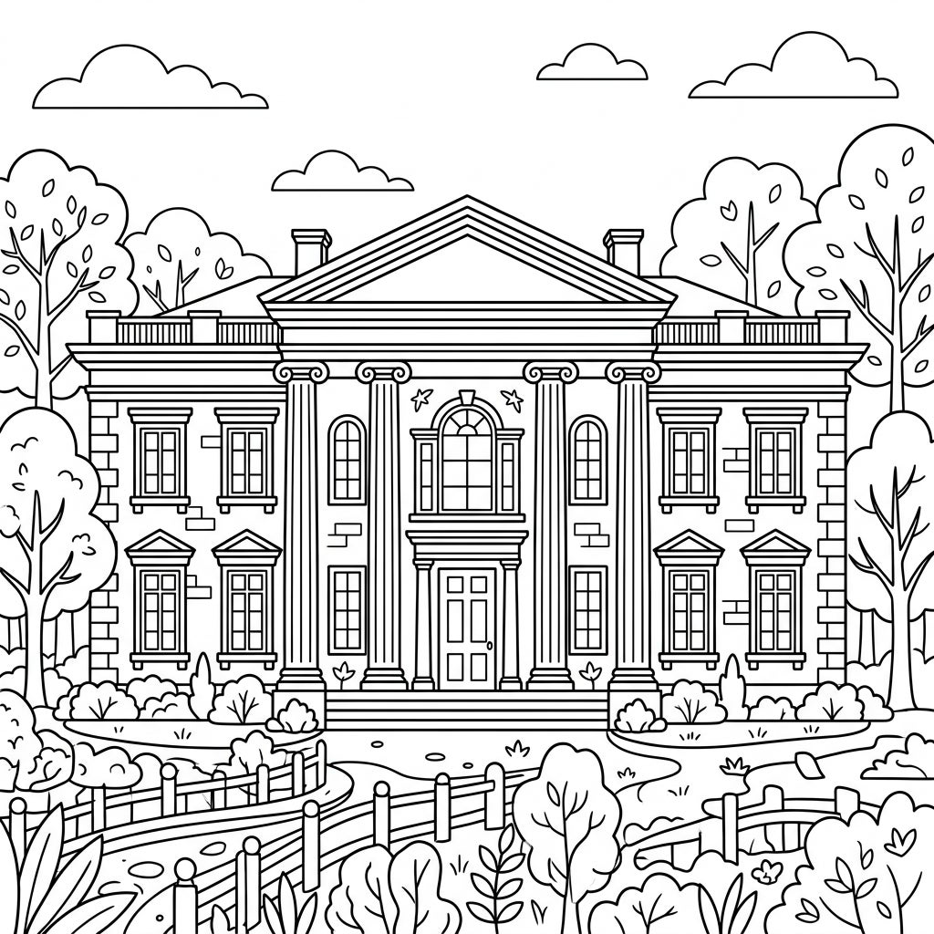 Ready to bring this historic home to vibrant life? Think about classic stone colors for the mansion – grays, creams, or even light pastels. The windows could be sparkling blue, and the roof a contrasting shade. For the lively garden, green is a must for the bushes and trees, but don't forget colorful flowers along the path! Encourage your child to experiment with different shades and textures to make this Neoclassical masterpiece truly their own.