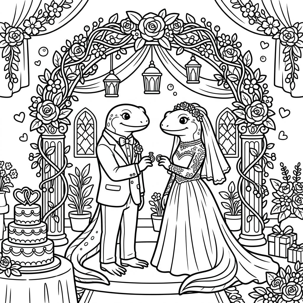 Witness an adorable newt couple exchanging vows in this delightful wedding coloring page. Perfect for celebrating love and adding a unique touch to your coloring collection.