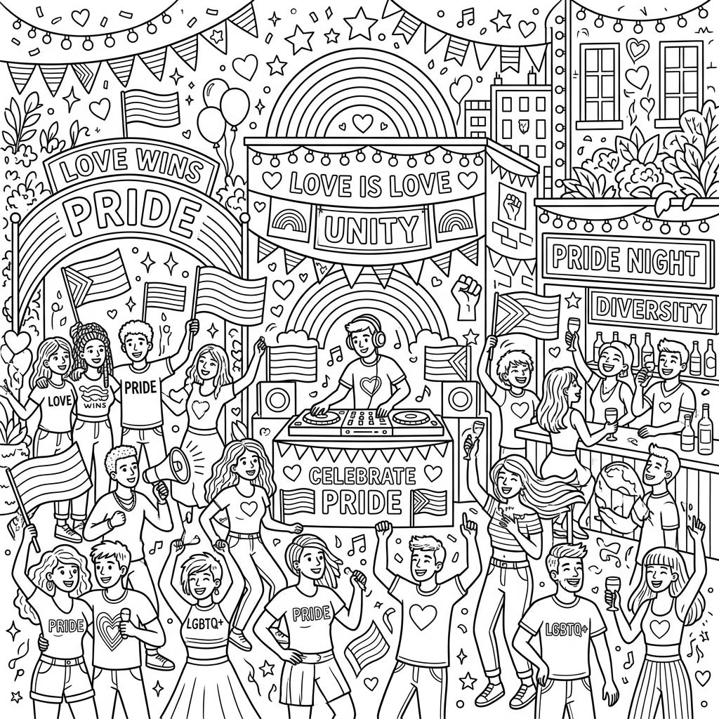 Dive into the heart of a lively Pride Night celebration with this dynamic coloring page. It captures the joy and diversity of a community coming together, complete with dancing revelers and a DJ.