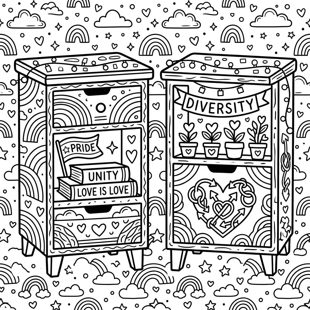 Dive into the spirit of Pride Month with this beautifully detailed coloring page featuring two nightstands adorned with symbols of love, unity, and diversity. Designed for teens, it offers a creative way to celebrate and express yourself.