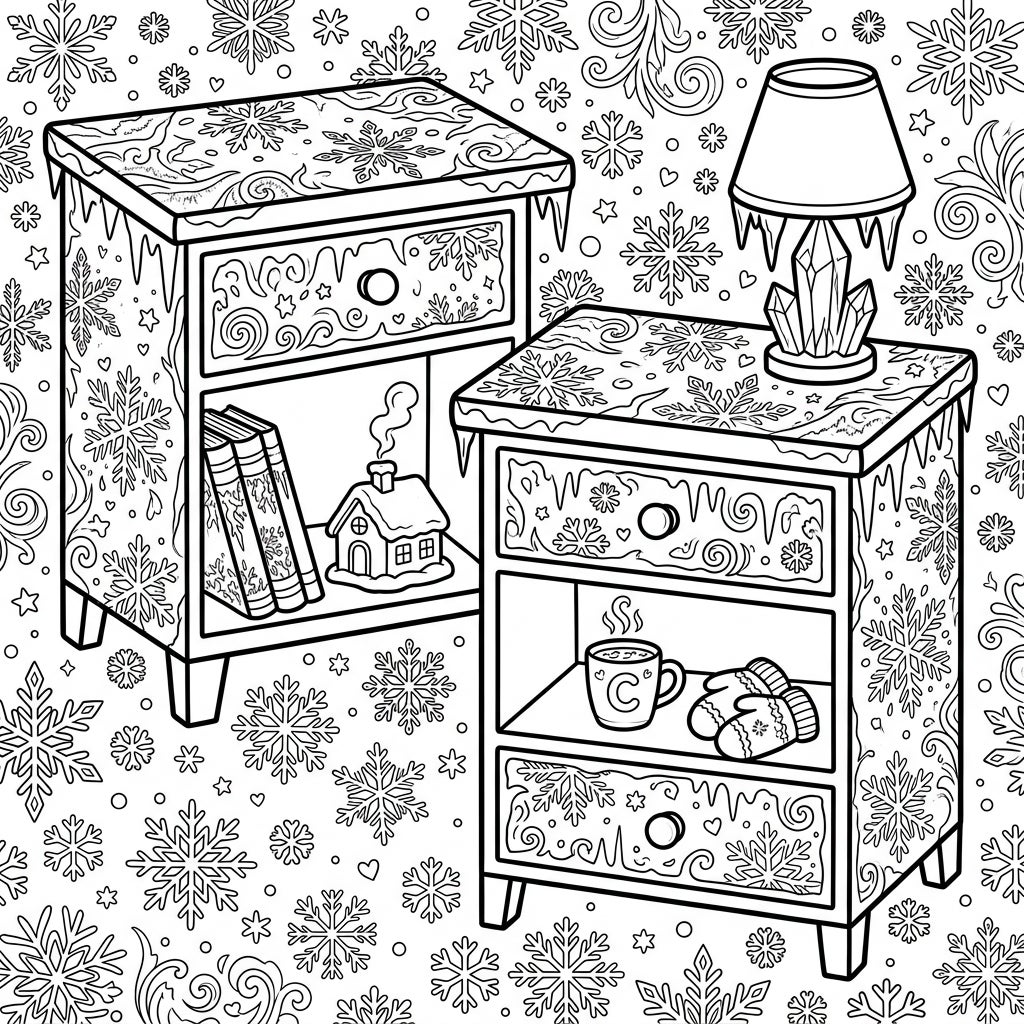Immerse yourself in the intricate details of this winter-themed coloring page, showcasing two beautifully adorned nightstands. Each piece of furniture is transformed into a frosty masterpiece, featuring delicate snowflakes, swirling patterns, and shimmering icicles dripping from their edges. Observe the cozy details: one nightstand holds a stack of books and a quaint snow-covered miniature house, while the other proudly displays an elegant crystal lamp, a steaming mug ready for a warm beverage, and a pair of snugly knitted mittens. The entire composition is rich with design, ensuring every corner offers an opportunity for your creative touch.
