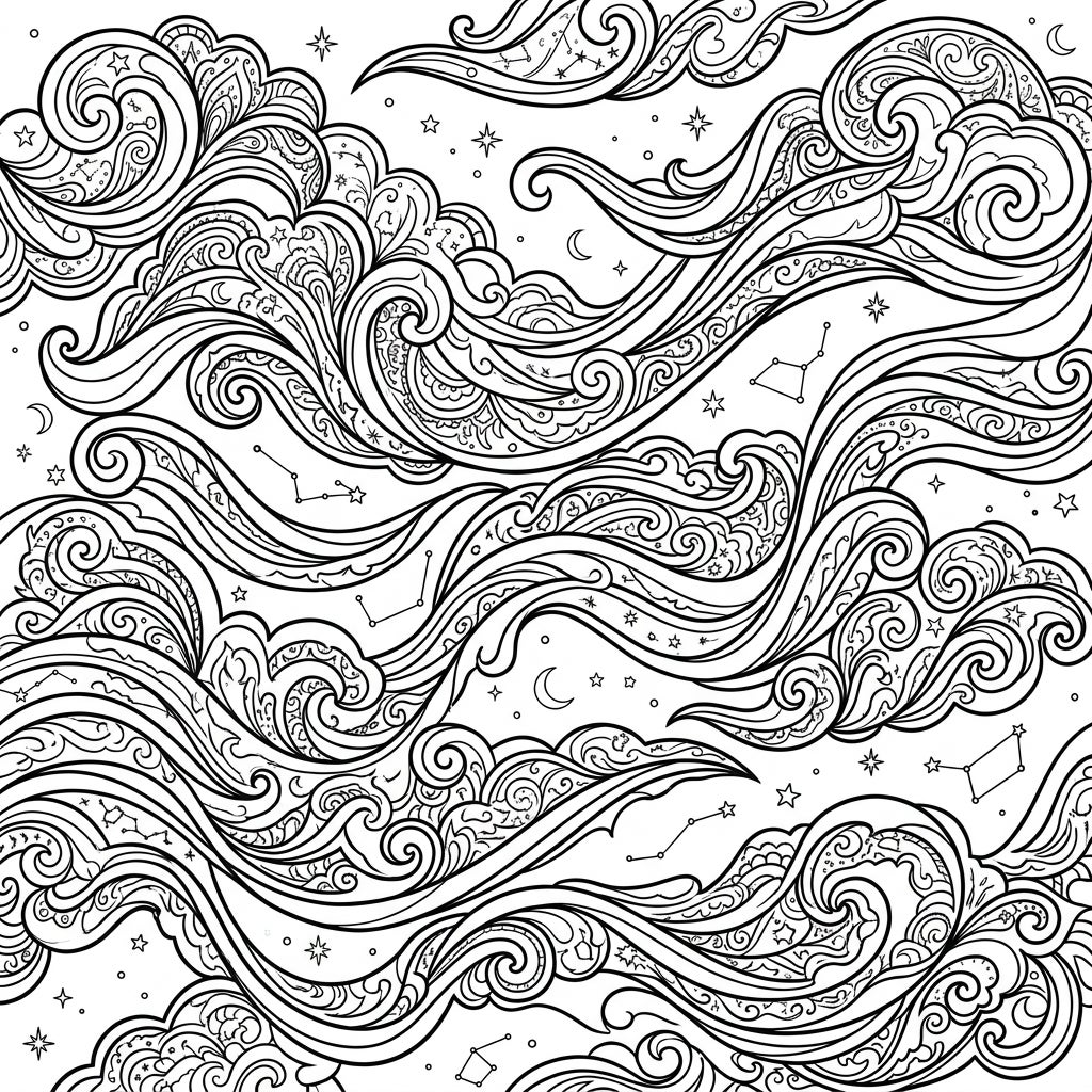 Dive into a stunning world of celestial beauty with this intricate adult coloring page featuring shimmering noctilucent clouds. Explore elaborate swirling patterns and subtle starry elements, offering a deeply engaging artistic experience.