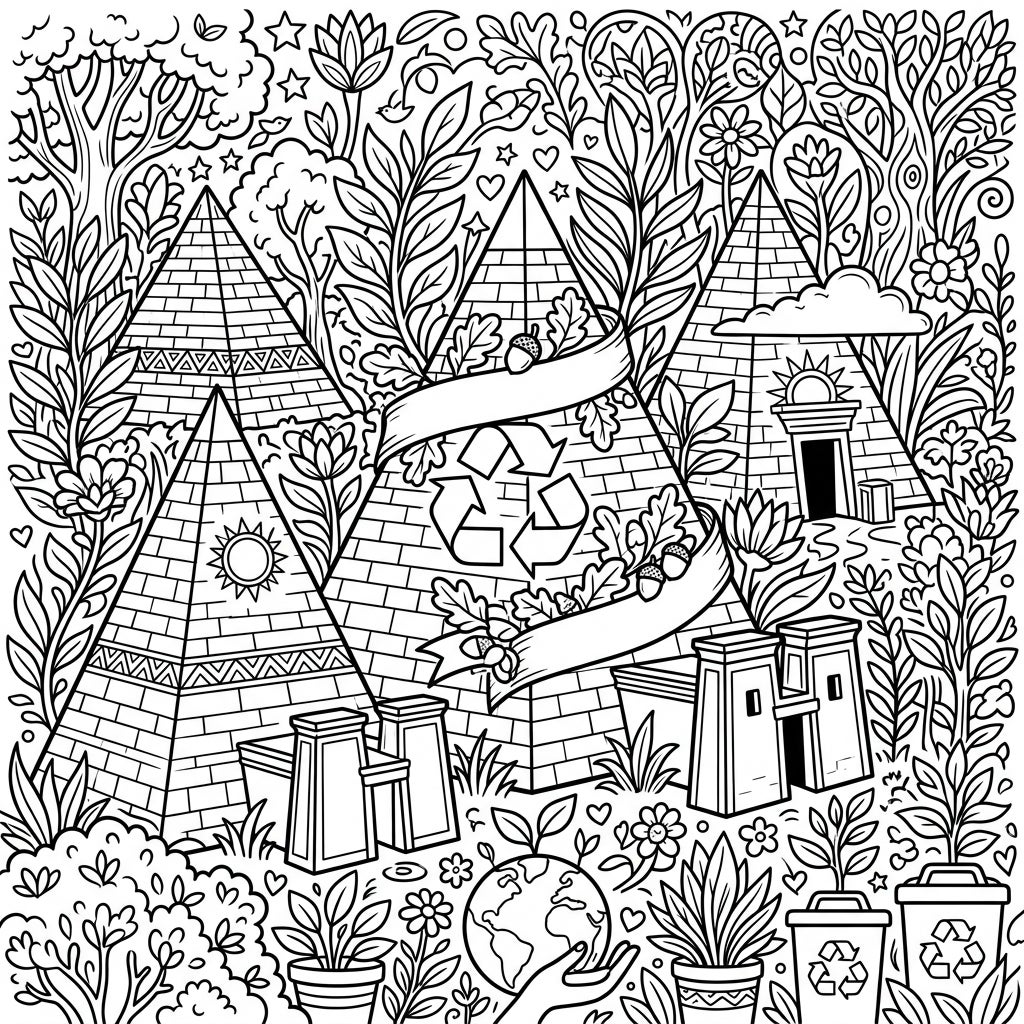 Unleash your creativity and breathe vibrant life into this intricate artwork. Consider a palette of warm desert hues for the Nubian Pyramids, contrasting beautifully with a spectrum of greens, blues, and earthy tones for the extensive natural elements. Highlight the recycling symbols with bright, hopeful colors like emerald green or sky blue to emphasize their importance. Experiment with different shading techniques and textures to add depth to the foliage and brickwork, making each pyramid and leaf uniquely your own. This page offers endless possibilities for personalized artistic expression.