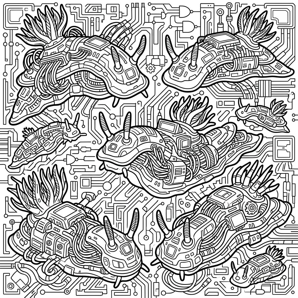 Unleash your creativity with this intricate coloring template featuring cyberpunk nudibranchs, blending marine life with a high-tech, futuristic vibe. Discover a world where sea slugs are reimagined with circuit boards and glowing neon outlines, offering a truly unique coloring experience.
