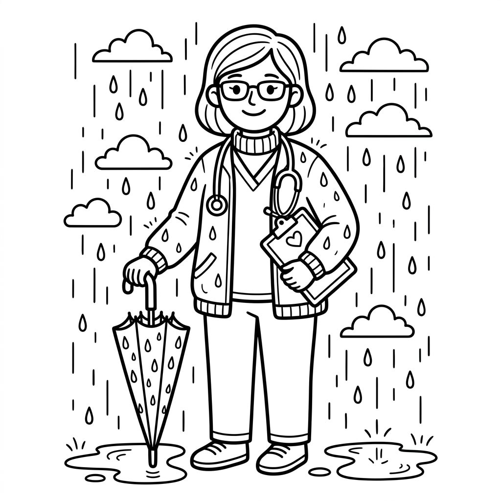 Step into a world of caring and coziness with this unique coloring page, featuring a dedicated nurse braving a rainy day. Our hero is depicted with kind eyes behind glasses, a friendly smile, and a practical bob hairstyle, clad in comfortable scrubs under a warm jacket, complete with a stethoscope draped around her neck. She thoughtfully holds a closed umbrella, ready for the elements, and a clipboard adorned with a heart, symbolizing her compassionate care. Surrounding her, stylized clouds gently release raindrops that create charming puddles at her feet, setting a peaceful yet purposeful scene.