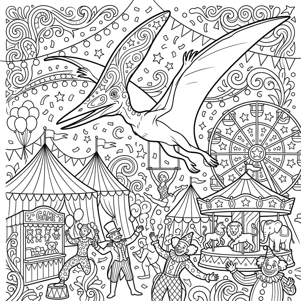 Get ready for a prehistoric party as a magnificent Nyctosaurus takes center stage at a lively carnival. This intricate coloring page combines ancient creatures with festive fairground fun, offering a unique and engaging artistic adventure.