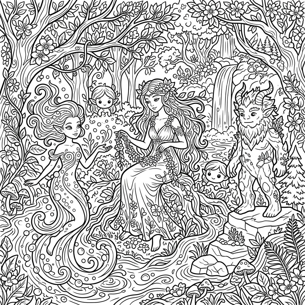 Step into a breathtaking scene where the mystical inhabitants of the forest gather. This intricate coloring page features a serene female nymph adorned with a floral garland, seated gracefully beside a flowing stream. Nearby, a dynamic water spirit emerges from the swirling currents, while a majestic, horned faun stands watch. Two adorable, smaller spirits peek from the lush foliage, adding a touch of whimsical charm to this vibrant woodland tableau.