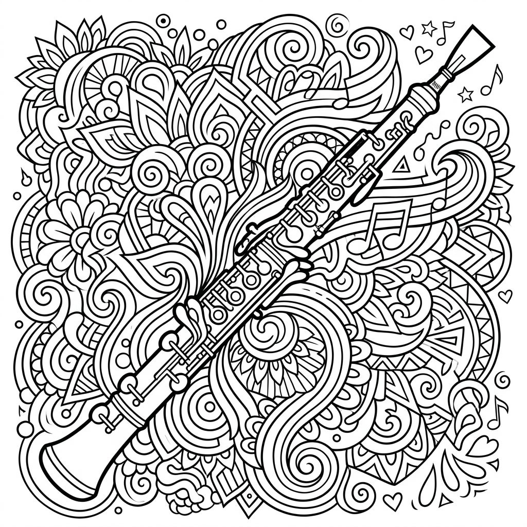 Prepare to be captivated by this stunning oboe coloring page, crafted specifically for the discerning teen artist. The central oboe, rendered with remarkable detail, showcases its distinctive keys and elegant form, inviting you to bring its musical presence to life. It rests amidst a riot of swirling patterns, featuring organic shapes, delicate florals, and abstract motifs that fill every corner of the design, promising hours of engaging artistic exploration.