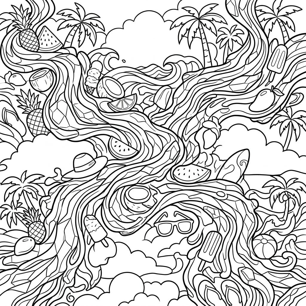 Step into a mesmerizing summer escape with this intricate coloring page, where the dramatic, glassy patterns of obsidian flows beautifully intertwine with a vibrant array of tropical delights. Your eyes will dance across thick, flowing lines that create a dynamic composition, revealing playful summer icons at every turn. Discover detailed pineapples, juicy watermelon slices, refreshing coconuts, and zesty citrus fruits nestled within the swirling currents, alongside delightful treats like ice creams and popsicles, all waiting for your artistic touch.