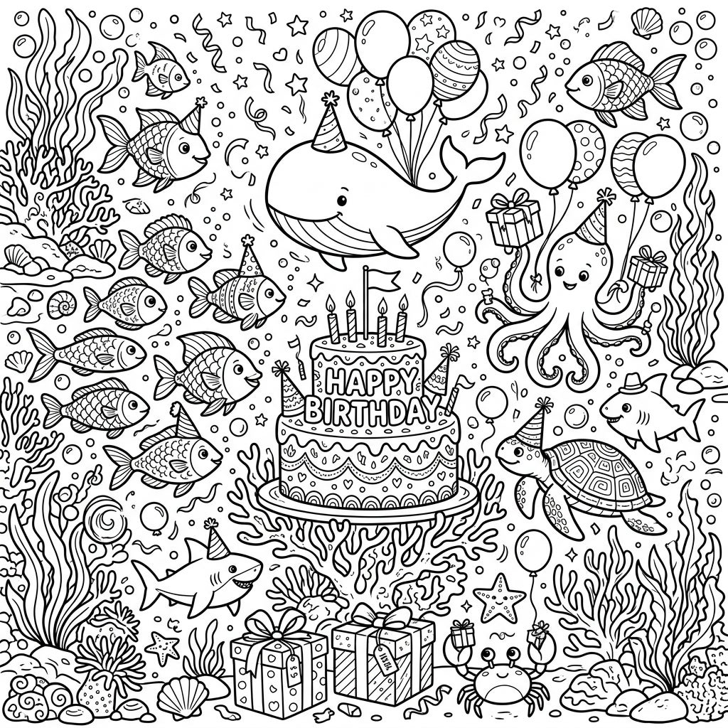 Immerse yourself in a spectacular undersea birthday celebration, intricately detailed for your coloring pleasure. This full-scene illustration brings to life a bustling ocean floor where a cheerful whale holds a bouquet of balloons, and a playful octopus juggles birthday presents. Surrounding a grand 'Happy Birthday' cake are a myriad of marine friends, including smiling fish, a cool shark, a jovial turtle, and a tiny crab, all adorned with festive party hats. Every corner of this scene, from the delicate coral reefs and swaying aquatic plants to the swirling confetti and effervescent bubbles, offers a new discovery.