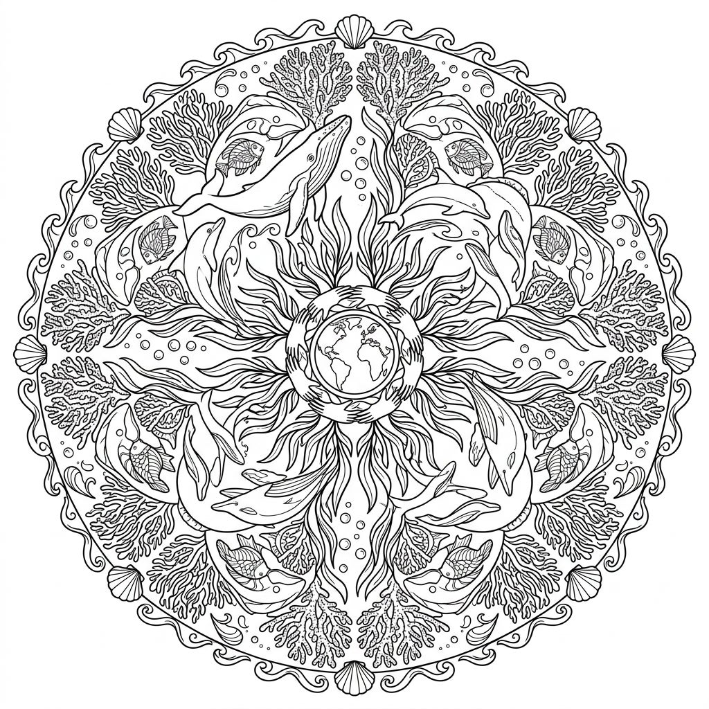 Explore the mesmerizing depths of our Earth Day Ocean & Sea Life Mandala coloring page. This intricately designed template features a perfectly symmetrical radial pattern that draws your eye to the heart of the design: a depiction of Earth gently embraced by hands, symbolizing protection. Radiating outwards, you'll discover a vibrant marine ecosystem brought to life with elegant whales, playful dolphins, various exotic fish, and a rich tapestry of coral reefs and aquatic plants, all adorned with delicate bubbles and a decorative wave and seashell border.