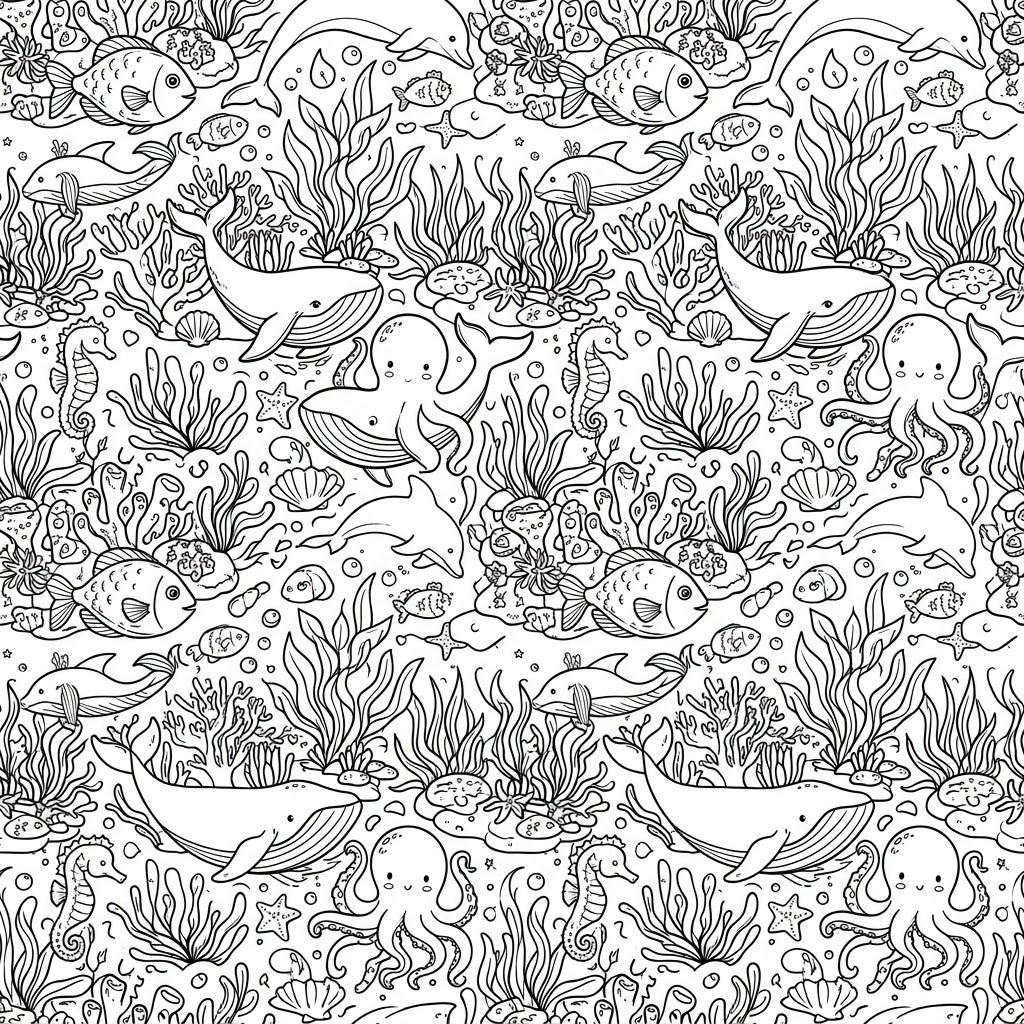 Explore the mesmerizing depths of the ocean with this intricately designed seamless pattern coloring page. Dive into a vibrant tapestry of marine life featuring graceful whales, playful dolphins, charming octopuses, and delicate seahorses, all intertwined with an abundance of detailed fish, starfish, seashells, and rich aquatic plants. Every corner of this pattern is a discovery, offering a delightful repeating canvas that ensures endless coloring possibilities.