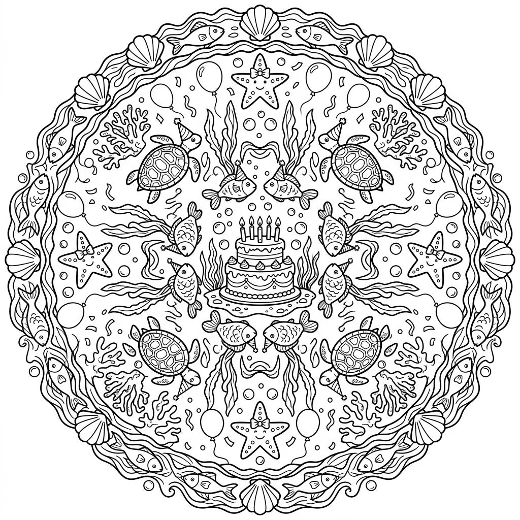 Dive into an enchanting underwater world where marine life celebrates! This intricate mandala combines the magic of the ocean with a joyful birthday party, ready for your creative touch.