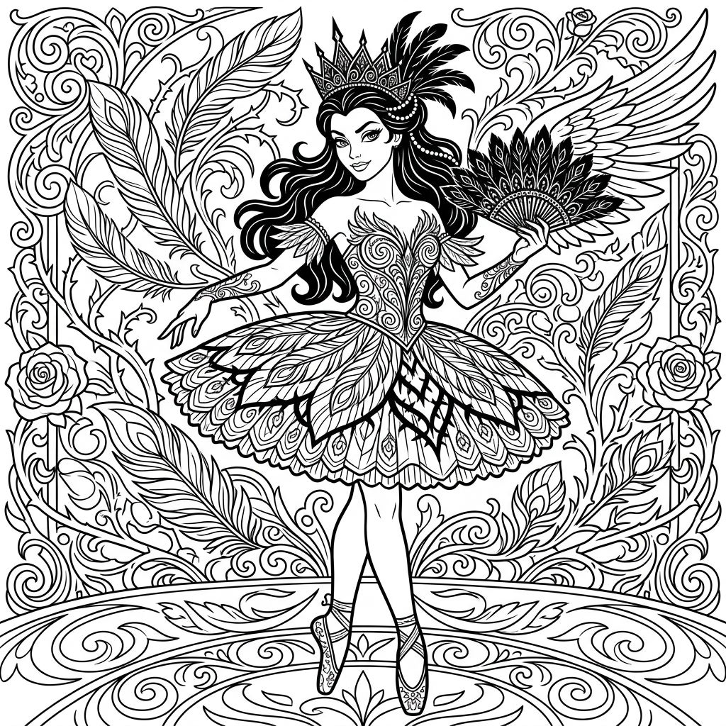 Delve into the dramatic elegance of Odile, the captivating Black Swan, with this intricately designed coloring page. Our illustration perfectly captures the villainous sorceress's allure, featuring her in a majestic, feathered tutu and a striking crown. Every detail, from the delicate patterns on her dress to the ornate fan she holds and the dramatic wings on her back, invites a sophisticated coloring experience for discerning teen artists.