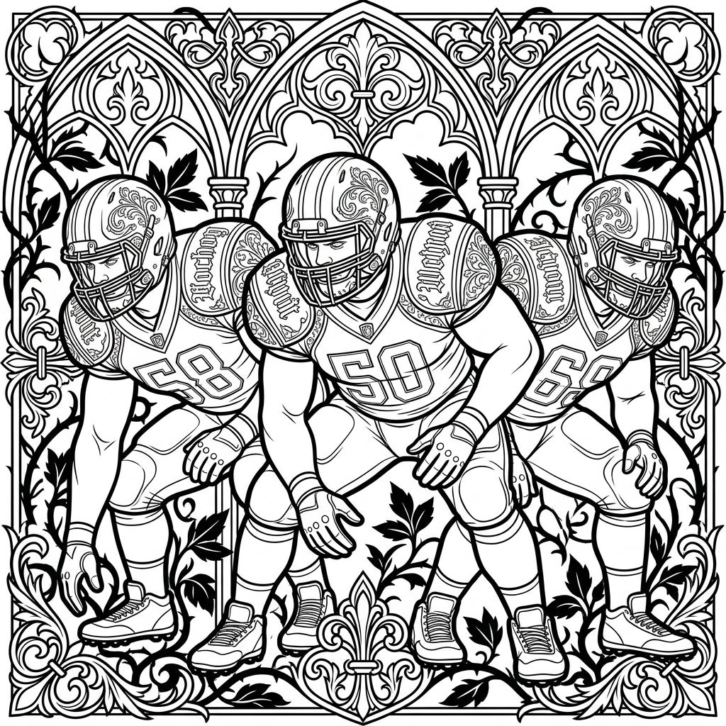 Dive into an extraordinary coloring experience with our 'Gothic Offensive Linemen' template. This intricate design showcases three powerful football offensive linemen, caught in dynamic poses and adorned with highly detailed gear. Each helmet, shoulder pad, and jersey features elegant, almost Victorian-inspired scrollwork and patterns, blending the brute force of the sport with an unexpected artistic refinement. The backdrop is a breathtaking tapestry of gothic architecture, complete with ornate arches, delicate fleur-de-lis motifs, and winding, thorny foliage that frames the scene beautifully.