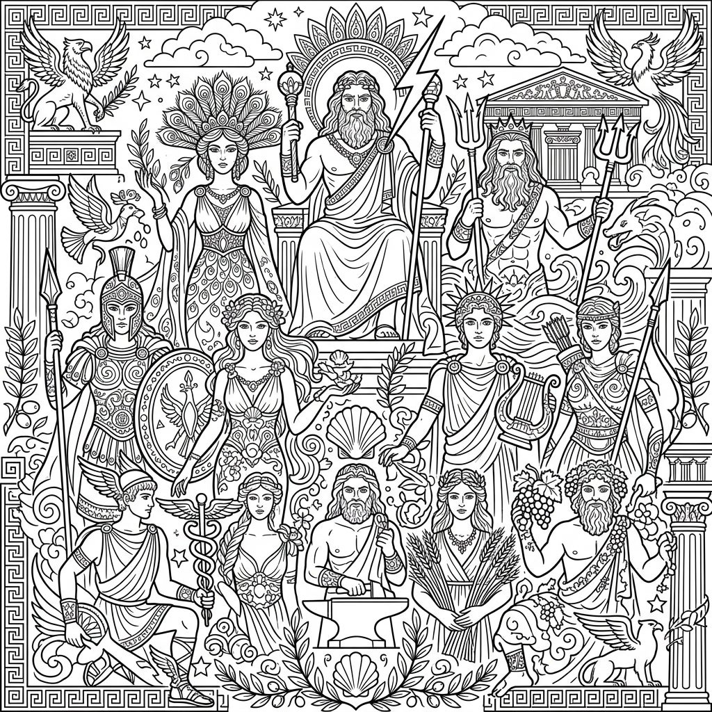 Embark on an epic artistic journey with this meticulously crafted adult coloring page, bringing the majestic world of the Olympian Gods to life. This intricate design showcases a grand assembly of the twelve principal deities, each rendered with exceptional detail and their iconic attributes. You'll discover Zeus, king of the gods, enthroned with his lightning bolt, alongside Poseidon with his trident, and Hera adorned with peacock feathers. Look closer to find Athena with her owl, Apollo with his lyre, Artemis with her bow, Aphrodite with her seashell, Hermes with his caduceus, Hephaestus at his forge, Demeter with wheat, and Dionysus with grapes, all enveloped within a rich tapestry of traditional Greek patterns, celestial stars, and mythical creatures like the powerful griffin and elegant phoenix.