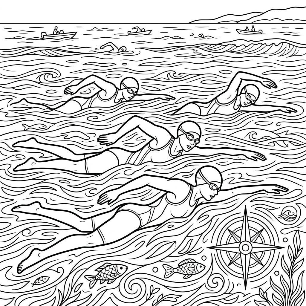 This intricate coloring template brings the thrilling experience of open water swimming to life. Observe the determined expressions and powerful strokes of three female athletes as they navigate through the expansive, wavy waters. The detailed line art captures the dynamic flow of the ocean or lake, with undulating waves, gentle swirls, and subtle aquatic flora like seaweed, along with small fish swimming beneath the surface. A prominent compass rose in the foreground adds a touch of navigational adventure, while distant boats and a serene coastline hint at the vastness of their journey.